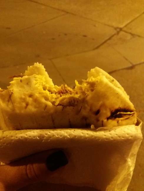 Para fechar a noite, experimentamos nossa primeira Arepa, comida originária da Venezuela, mas muito comum na Colômbia também, uma tortilha meio que de farinha de mandioca, meio de milho que normalmente se come lá com queijo, mas essa barraquinha de rua que vimos vendia elas com vários recheios, estilo um cachorro quente. Muito bom (e barato), alimenta muito bem!
