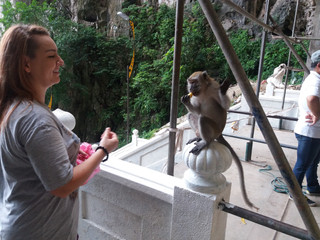Descendo do metrô, numa curta caminhada já se chega na entrada do complexo (novamente, só seguir a leva de turistas), e no caminho mesmo já depara-se com diversas banquinhas de artesanatos e frutas, com destaque para a venda de bananas aos turistas para oferecer aos macaquinhos que ficam nas escadarias do templo (sim, são muitos e essa também é uma das atrações das Batu Caves). Eu, desde que o Canadense do nosso quarto em Bangkok contou a história de que foi mordido por um macaco, estava evitando ao máximo esses bichos, mas a Juju quis encarar a atração então compramos umas bananas superfaturadas ali nas banquinhas (superfaturadas para a Malásia, comparando aos preços no Brasil ainda era muito barato!) para oferecer aos macaquinhos.